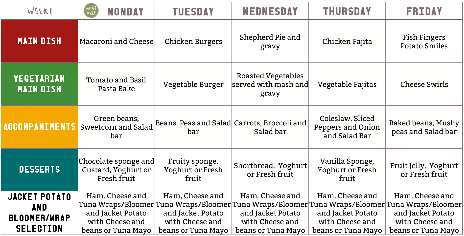 Week 1 menu is available on the weeks beginning 26th January and 9th March.