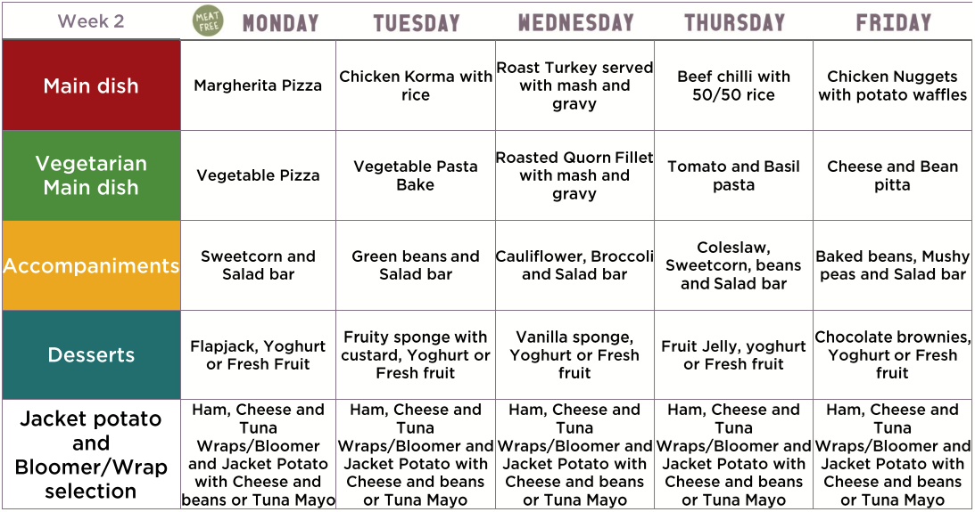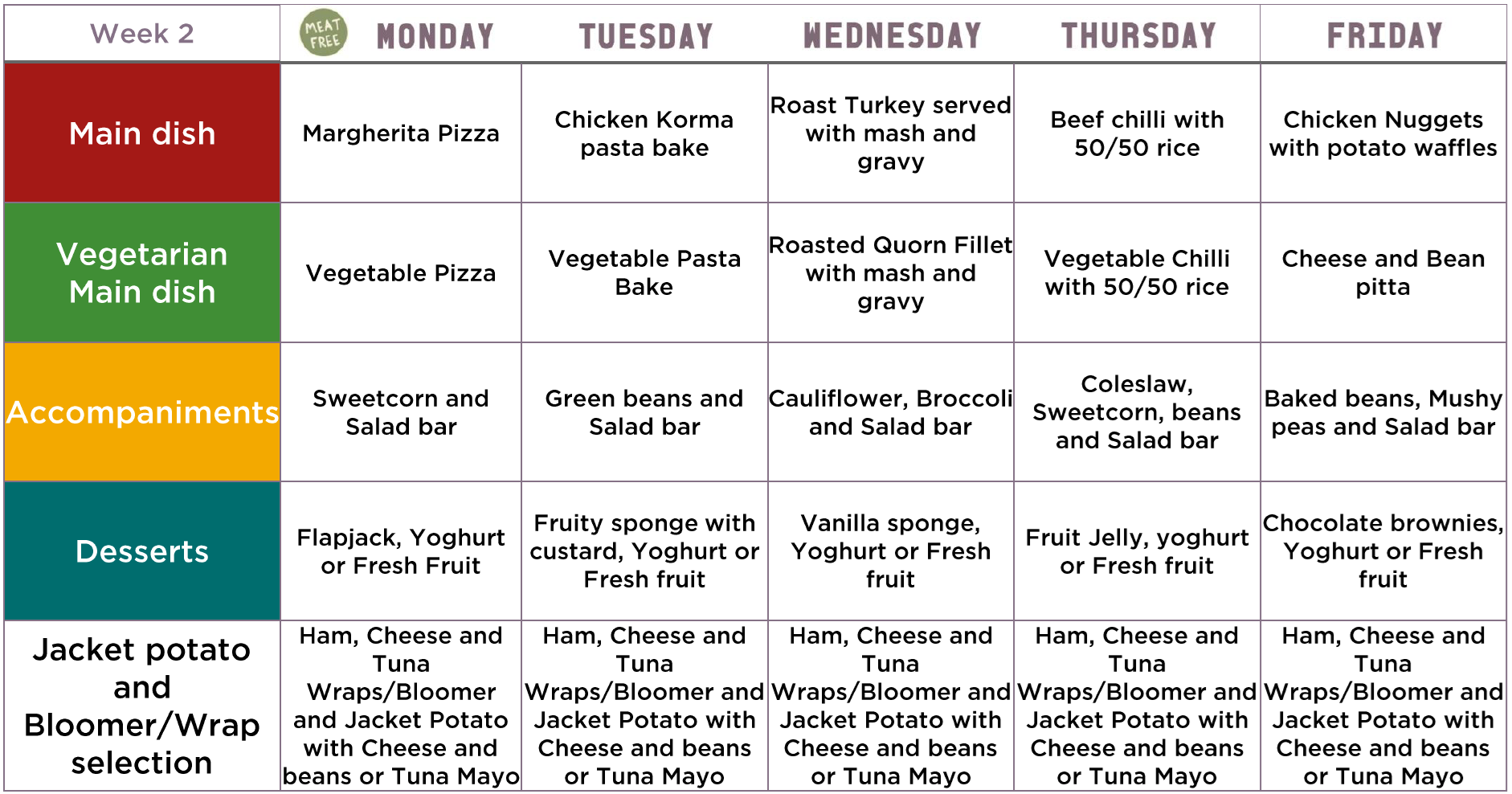 Week 2 Menu is available on the weeks beginning 2nd February, 23rd February and 16th March.