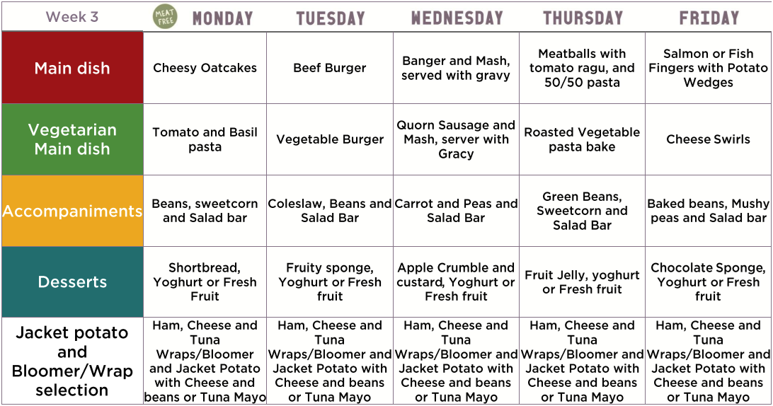 Week 3 menu is available on the weeks beginning 9th February, 2nd March and 23rd March.